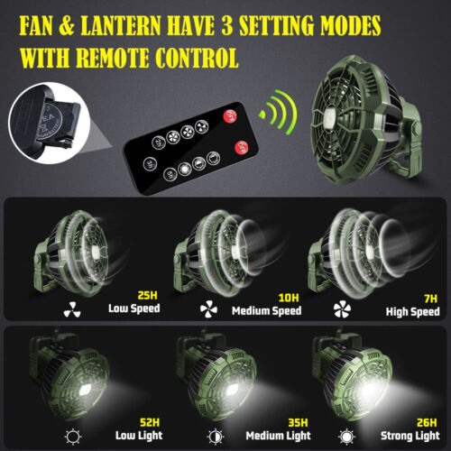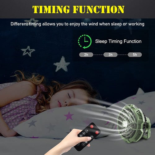 • ADJUSTABLE WIND & BRIGHTNESS - The portable camping fan has 3 levels of wind speed and 3 levels of LED brightness. You can adjust the modes easily by remote control or buttons. Meanwhile there are different timing hours that can allow you to enjoy the wind when sleep, not make a loud sound.